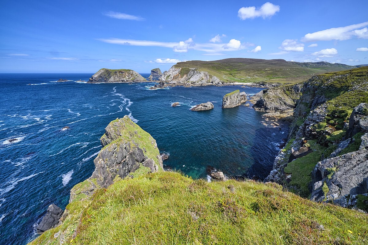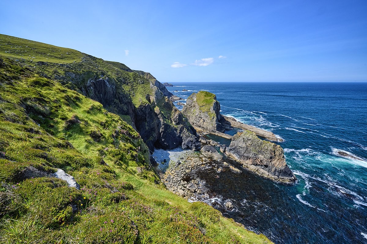 Da ich am Nachmittag hier eintraf, entschied ich mich dazu, ein Stück lang dem Wanderweg zu folgen und dann querfeldein entlang der Klippen zu gehen. Der Küstenabschnitt bot jede Menge attraktiver Fotomotive und auch einige Schafe drängten sich ins Bild. Im Gepäck hatte ich anschließend viele typisch irische Motive mit grünen Wiesen, einer schroffen Küste und dem tiefblauen Atlantik.